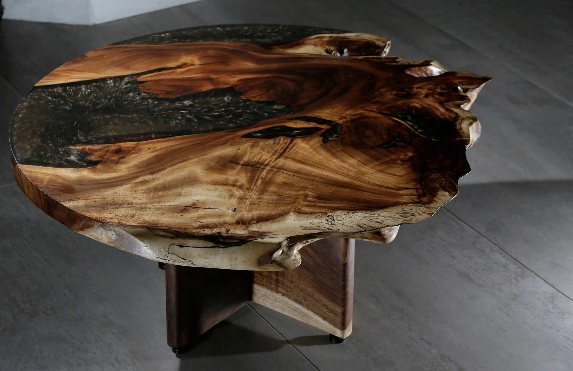 This 38" round and live edge Monkey Pod piece has a beefy 2" thick top with a beautiful epoxy fill accentuating the table's crazy grain. The MCM-inspired base is also Monkey Pod, bringing the height to 16.75".